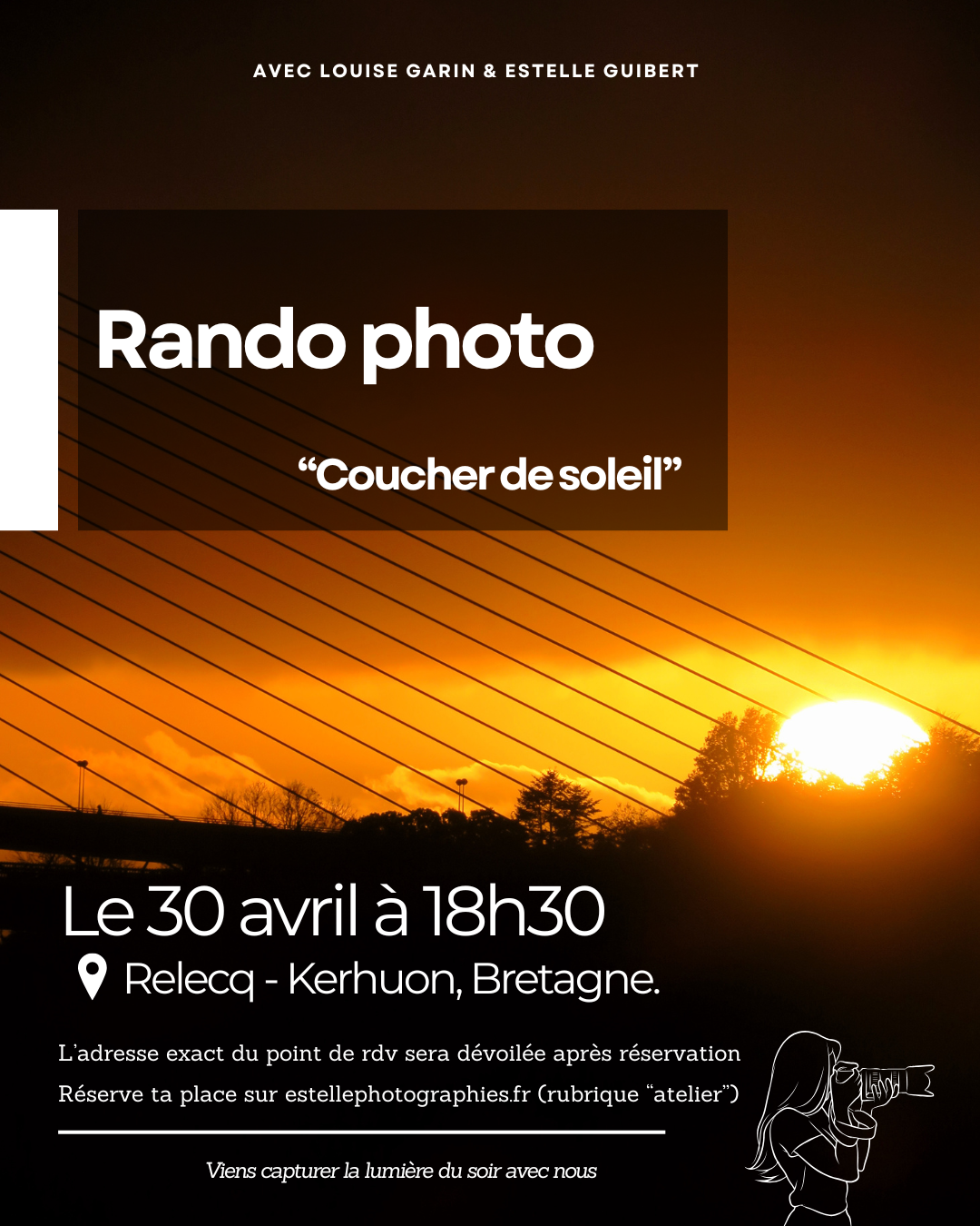 On t’emmène le 30 avril à 18h30 au Relecq-Kerhuon (Bretagne) pour une randonnée photo conviviale au moment où la lumière devient douce, chaude et inspirante ✨